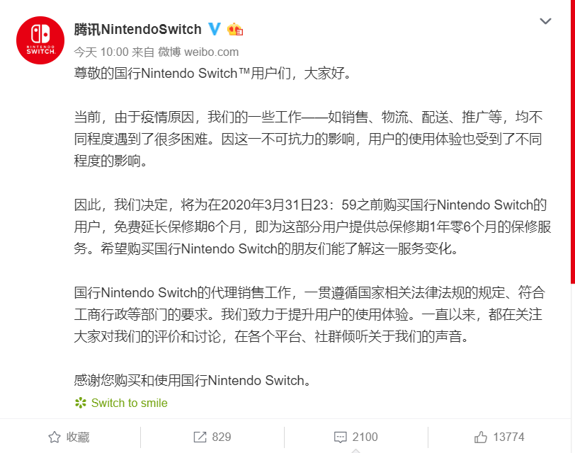 速途網訊 今日,騰訊引進Nintendo Switch官方微博發文稱,受疫情影響,其銷售、物流、配送、推廣等均不同程度遇到困難,因此將為在2020年3月31日23:59之前購買國行Nintendo Switch的用戶,免費延長保修期6個月,即為這部分用戶提供總保修期1年零6個月的保修服務。
