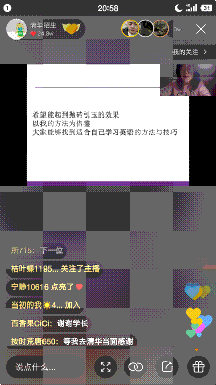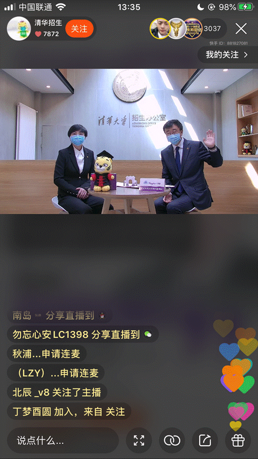 別緊張,這不是正在進(jìn)行英語聽力測(cè)試的考場(chǎng),而是清華大學(xué)招生辦公室在快手的官方直播間。高考英語148分,現(xiàn)就讀于清華大學(xué)經(jīng)管學(xué)院的梁幸子同學(xué),正在給近3萬聽眾分享她的英語學(xué)習(xí)經(jīng)驗(yàn)。從聽力速記的小技巧,到轉(zhuǎn)折語氣詞的常見套路,梁幸子從自己備考時(shí)的親身經(jīng)歷出發(fā),一點(diǎn)一滴的還原出148分的學(xué)霸之路。半個(gè)小時(shí)的分享結(jié)束,直播間被滿屏的“謝謝“刷屏,少年們依依不舍的向?qū)W姐告別,“學(xué)姐,清華見!“