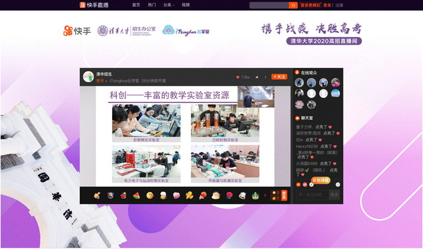 為了幫助全國(guó)的高三學(xué)子更好地備戰(zhàn)高考,明確專業(yè)選擇,志愿填報(bào)心里有底,也讓中學(xué)生及所有心系清華的人感受到清華的魅力。3月1日,清華大學(xué)招生辦公室聯(lián)合快手推出iTsinghua云學(xué)堂,暨清華大學(xué)2020高招直播系列活動(dòng)。通過專業(yè)認(rèn)知講座、高招政策宣講、備考經(jīng)驗(yàn)分享、拔尖創(chuàng)新人才貫通培養(yǎng)試點(diǎn)等四大板塊,向社會(huì)開放清華大學(xué)的優(yōu)質(zhì)教育資源,推動(dòng)基礎(chǔ)教育與高等教育的銜接貫通。