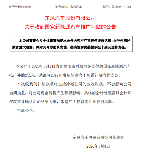 東風汽車:收到2億元國家新能源汽車推廣補貼 仙雯 ? 2020年3月4日 09:24 ? 快訊, 汽車 速途網訊 昨日,東風汽車公告稱,公司于3月2日收到襄陽市財政局轉支付的國家新能源汽車推廣補貼2億元,系部分2017年度新能源汽車購置補貼清算資金。此次收到的補貼款項將直接沖減公司的應收賬款,不會影響公司當期損益,對公司現金流將產生積極影響。 東風汽車 贊 (0) 仙雯 0 生成海報 QQ Mac版本更新,新增作業功能 上一篇 2020年3月4日 09:22 分析師:新冠病毒疫情不影響蘋果5GiPhone的發布 下一篇 2020年3月4日 09:26