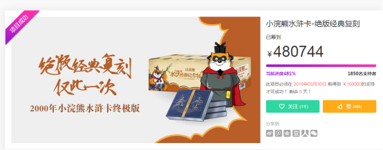 許是為了繼續收割情懷,2018年,統一小浣熊官方推出復刻版水滸英雄卡懷舊紀念品的眾籌活動,引發眾人關注。來自京東眾籌平臺上的信息顯示,該項目眾籌成功,至結束時已有1850名支持者,達到481%的進度,籌款總額為480744元。