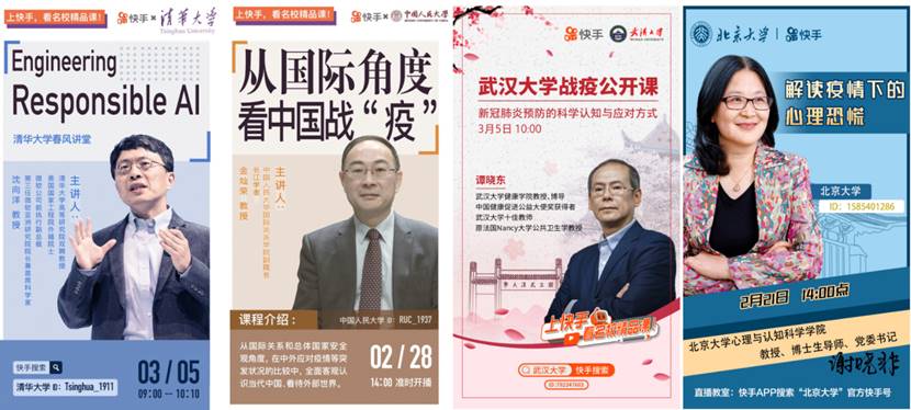 其實自2月份以來,快手網(wǎng)友們陸續(xù)從清華、北大、復旦、浙大、北師大等數(shù)十所頂尖高校的直播間在線觀看了“名校精品課”,透過小小的手機屏幕觀天下。