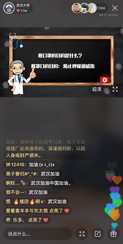 自強、弘毅、求是、拓新,在這場突如起來的疫情中,每個武大人都遵循學校校訓,在各自的崗位發揮力量。而武大作為疫區中心的高校,在輸送優秀人才之余,更是主動承擔起傳播知識、打破恐慌焦慮等責任,借助快手等短視頻平臺的天然優勢,通過信息透明化、正能量傳遞,讓更多人走進武漢的真實情況。