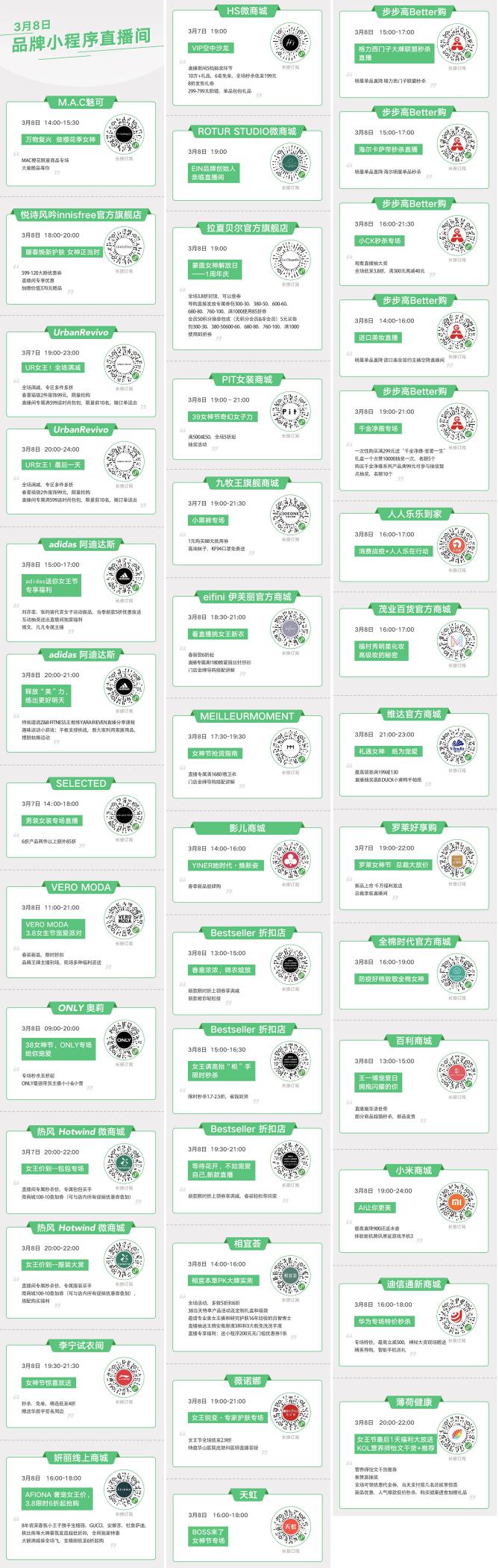 此外,悅詩風吟、迪信通、SELECTED、ONLY、VEROMODA、李寧、HS、瑋言、PIT、影兒、Bestseller折扣店、相宜薈、薇諾娜、維達、羅萊、百利、小米、步步高、薄荷健康等品牌也將在小程序直播中為消費者帶來多重福利。消費者還可在微信“搜一搜”搜索“女神節”,收獲“女神節”購物攻略。
