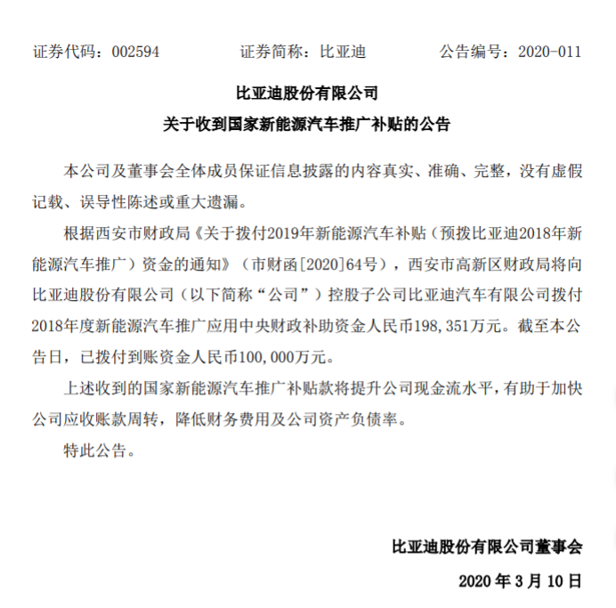 比亞迪:收到國家新能源汽車推廣補貼10億元 仙雯 ? 2020年3月11日 09:22 ? 快訊, 汽車 速途網訊 昨日,比亞迪發布公告,西安市高新區財政局將向公司控股子公司比亞迪汽車有限公司撥付2018年度新能源汽車推廣應用中央財政補助資金19.84億元。截至目前,已撥付到賬資金10億元。 比亞迪 贊 (0) 仙雯 0 生成海報 蔚來2月份整體交付量為707臺 上一篇 2020年3月11日 09:20 長城汽車:2月汽車銷量10023輛,同比下降85.48% 下一篇 2020年3月11日 09:24