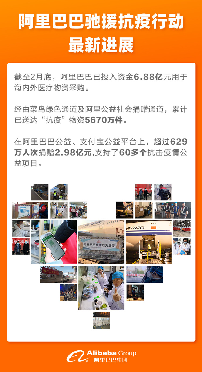 阿里巴巴:截至2月底,已投入資金6.88億元用于海內(nèi)外醫(yī)療物資采購 仙雯 ? 2020年3月12日 10:56 ? 公益 速途網(wǎng)訊 今日,阿里巴巴公布10億抗疫基金最新進展。截至2月底,阿里巴巴已投入資金6.88億元用于海內(nèi)外醫(yī)療物資采購。經(jīng)由菜鳥綠色通道及阿里公益社會捐贈通道,累計已送達(dá)“抗疫”物資5670萬件。 阿里巴巴 贊 (0) 仙雯 0 生成海報 航班管家IPO輔導(dǎo)期發(fā)生人事變動,凱撒旅游陳小兵加入董事會 上一篇 2020年3月12日 10:53 Twitter強制要求所有員工在家辦公 下一篇 2020年3月12日 10:59