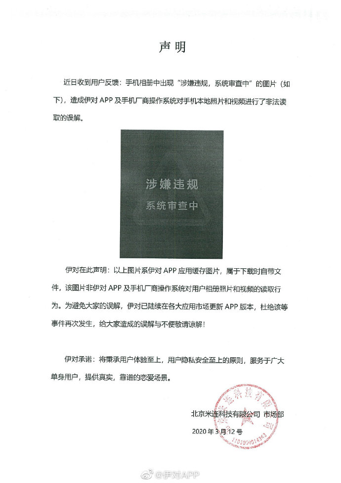 速途網(wǎng)訊 今日,伊對(duì)APP回應(yīng)“違規(guī)圖片”事件。伊對(duì)App表示,該圖片系伊對(duì)APP應(yīng)用緩存圖片,屬于下載時(shí)自帶文件,該圖片非伊對(duì)APP及手機(jī)廠商操作系統(tǒng)對(duì)用戶相冊(cè)照片和視頻的讀取行為。同時(shí),伊對(duì)App稱,為避免大家的誤解,伊對(duì)已陸續(xù)在各大應(yīng)用市場更新APP版本。