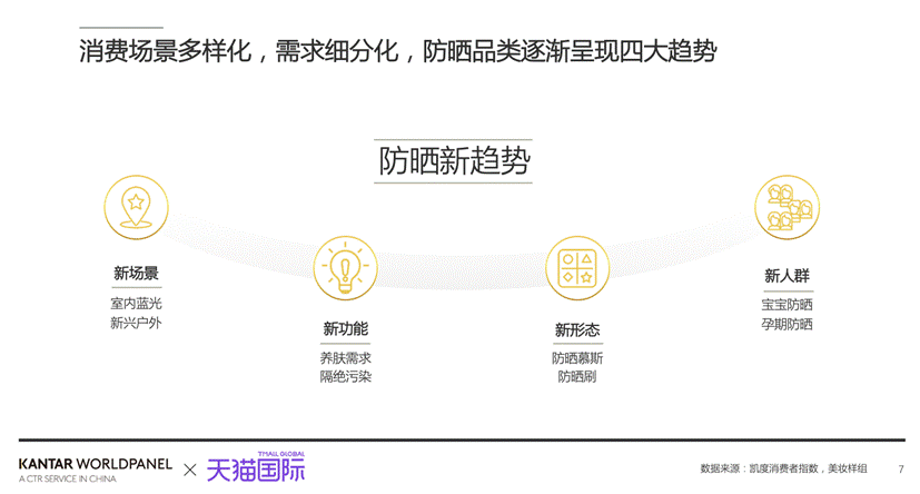 3月16日,天貓國際聯合凱度消費者指數發布《解碼中國消費者新防曬時代》報告,防曬市場向新場景、新功能、新形態、新人群四大方向發展,抗藍光、補水保濕、抗老、抗污染等防曬細分需求涌現。
