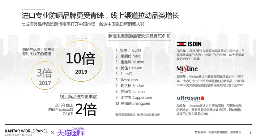 泰國彩妝品牌Mistine成功打造出2個百萬級銷量的防曬單品,2019店鋪防曬類目成交同比增長超80%。引領敏感肌防曬的瑞士品牌Ultrasun,2018年5月入駐天貓國際,開業首周銷售額突破180萬,并以年同比200%高速增長。