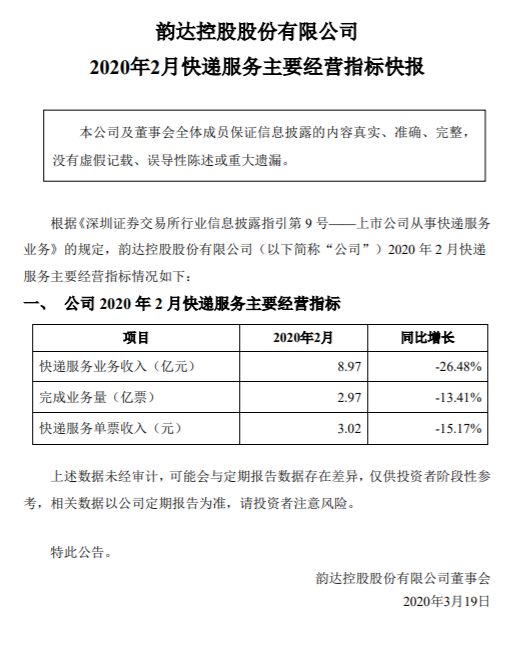 韻達股份:2月快遞服務業務收入,同比下降26.48% 仙雯 ? 2020年3月19日 09:30 ? 快訊, 貨運物流 速途網訊 昨日,韻達股份公告稱,2月快遞服務業務收入8.97億元,同比下降26.48%。完成業務量2.97億票,同比下降13.41%。快遞服務單票收入3.02元,同比下降15.17%。 韻達股份 贊 (0) 仙雯 0 生成海報 蔚來2019年第四季度營收28.5億元,同比下降17.1% 上一篇 2020年3月19日 09:27 攜程:向海外10國捐贈100萬枚醫用標準口罩 下一篇 2020年3月19日 09:35