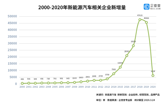 企查查數據顯示,從2000年開始,我國的新能源汽車相關企業注冊量緩慢增加,當年共新增0.04萬家,2014年開始新增速度顯著加快,當年共新增0.8萬家,是2000年新增量的20倍左右。2018年達到了目前為止(2020/03/24)的相關企業新增量之最,共4.8萬家,2019年,相關企業數量的新增速度有所放緩,共新增4.6萬家,稍遜于2018年的新增量,仍為2010年新增量的21倍有余。
