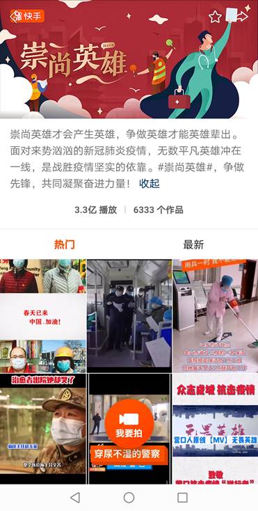 2020年春節,新型冠狀病毒不斷蔓延,改變了人們正常的生產生活秩序。面對這場突如其來的疫情,無數平凡英雄沖在一線,用實際行動踐行著初心使命與責任擔當,呈現出種種動人的“戰疫”故事,這些感人瞬間也通過快手被越來越多的人看到。相比17年前的非典,短視頻的流行不僅為疫情防控提供了全新的信息交互方式與服務,更記錄著大量來自基層的鮮活故事,匯聚成抗“疫”中的正能量群像。