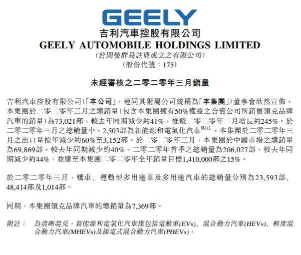 吉利汽車:1-3月汽車總銷量為20.6萬部,同比下降44% 仙雯 ? 2020年4月7日 16:53 ? 快訊, 汽車 速途網訊 今日,吉利汽車在港交所發布公告稱,1-3月汽車總銷量為20.6萬部,同比下降44%。吉利汽車3月銷量7.3021萬部,同比減少41%,環比增長245%,其中,2503部為新能源和電氣化汽車。 贊 (0) 仙雯 0 生成海報 香飄飄董事兼副總經理蔡建峰離職 上一篇 2020年4月7日 16:51 速途短視頻王佩:羅永浩的真正目的絕不是做直播帶貨一哥 下一篇 2020年4月7日 16:55