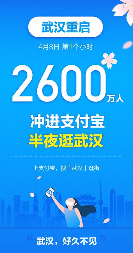 另據(jù)支付寶數(shù)據(jù)顯示,武漢重啟的第一天凌晨,武漢的各種美食、美景被搬上支付寶首頁,打開就能云逛武漢,上線一小時(shí),已經(jīng)有2600萬人在手機(jī)上逛武漢了。