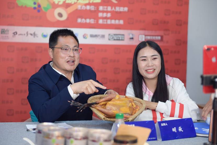 除了通江銀耳、巴山土雞之外,副縣長(zhǎng)張春根、商務(wù)局局長(zhǎng)王波也相繼上場(chǎng),為通江臘腸、臘肉、香菇、木耳、菜籽油、農(nóng)家米等產(chǎn)品做了代言。