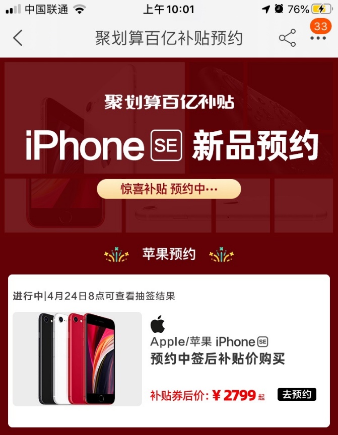 速途網4月18日消息(報道:李楠)今日,速途網發現,聚劃算百億補貼已于4月18日上線新iPhone SE,售價為2799元(64G)起,較原價立減500元,相當于85折,系全網最低價。目前,消費者打開淘寶進入聚劃算百億補貼,就有機會通過預約方式買到。