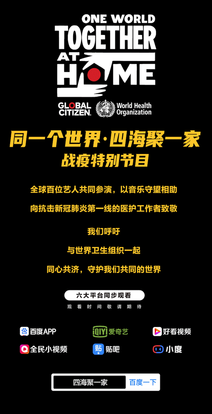 據(jù)了解,本次活動由世界衛(wèi)生組織聯(lián)合公益組織“全球公民(Global Citizen)”共同舉辦,時(shí)長8小時(shí),意在鼓舞全球公民眾志成城對抗疫情,并向前線救死扶傷的醫(yī)護(hù)工作者們表達(dá)敬意。