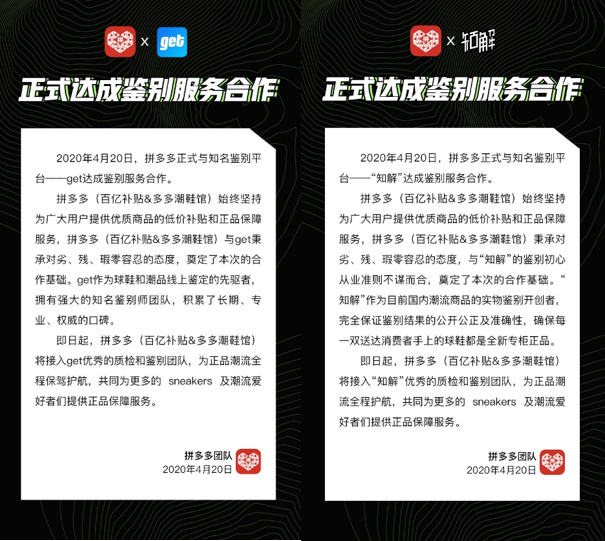 速途網4月20日消息(報道:李楠)今日,拼多多宣布,已與國內兩大權威球鞋鑒別平臺“get”“知解”正式達成鑒別服務合作。