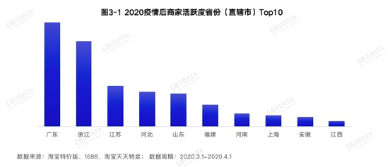 第一財經商業數據中心26日發布的《2020中國產業帶數字化發展報告》,對淘寶特價版上超過100萬的商家進行了整體分析。《報告》顯示,通過淘寶特價版擁抱數字化的商家在疫情中率先恢復,平臺上22個省份的商家活躍度超過了疫情之前水平,廣東、浙江、江蘇等數字化轉型較快省份,商家活躍度領跑全國。