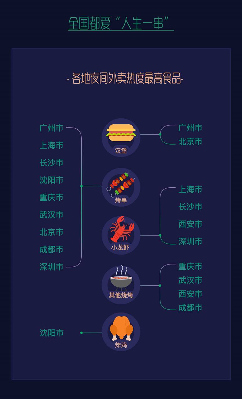 夜宵江湖戰況“激烈”,烤串成為多個城市美團用戶最愛的夜間外賣。面包甜點、小龍蝦、火鍋、奶茶等其他宵夜品類也有明顯增長,折算成等價食物,約等于北京人民吃掉33萬串烤串,武漢人民吃掉22萬串烤串,上海人民吃了24萬只小龍蝦,逛吃逛吃”成為夜晚首選。北京人民最愛三里屯,重慶人都去解放碑。