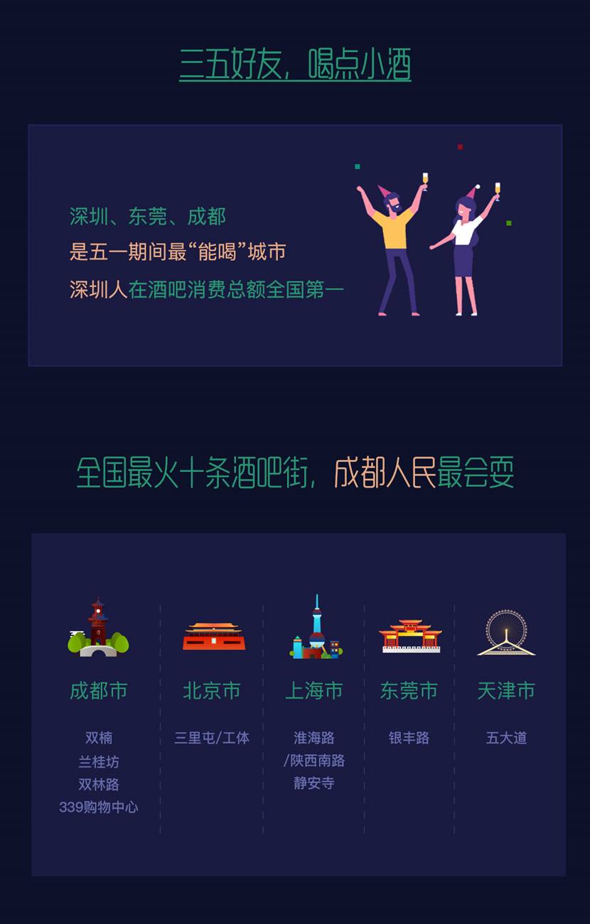 深圳、東莞、成都,是在五一期間最“能喝”的城市,深圳人在酒吧的消費全國第一。根據美團數據,成都人民最愛耍,全國最火熱的10條酒吧街,成都占據4個名額,小酌兩杯成為假期夜間的熱門選擇。