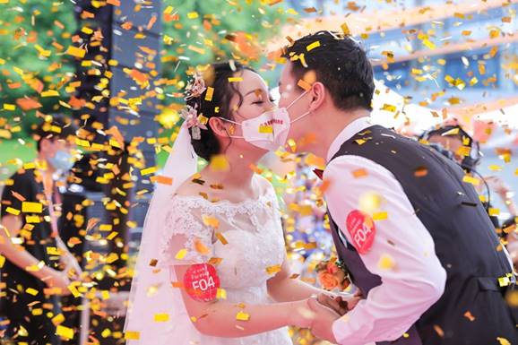 雖然口罩集體婚禮,現場夫妻之間還是辨認對方毫無難度,口罩也貼上了五顏六色的個性貼紙,玩得不亦樂乎。經歷了這場突如其來的疫情之后,他們更認定自己身邊的另一半。