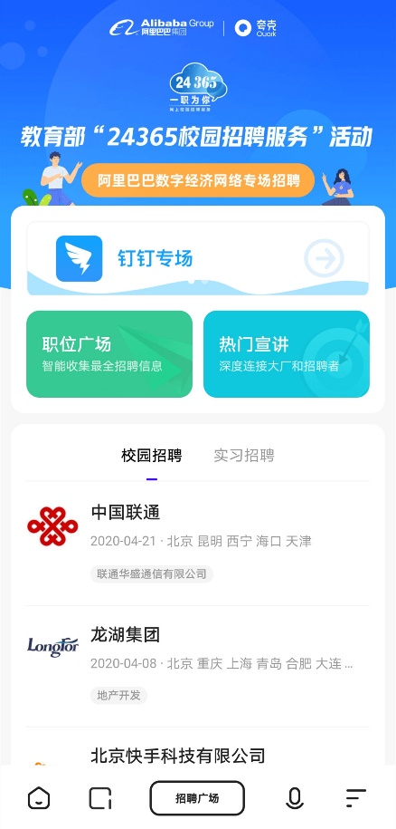 5月11日起,大學(xué)生在夸克搜索“找工作”關(guān)鍵詞,或者在首頁“捷徑”入口點擊“找工作”,可以進入招聘會專區(qū)。通過釘釘APP、支付寶APP搜索“校招”小程序也可以直接進入線上招聘會場。