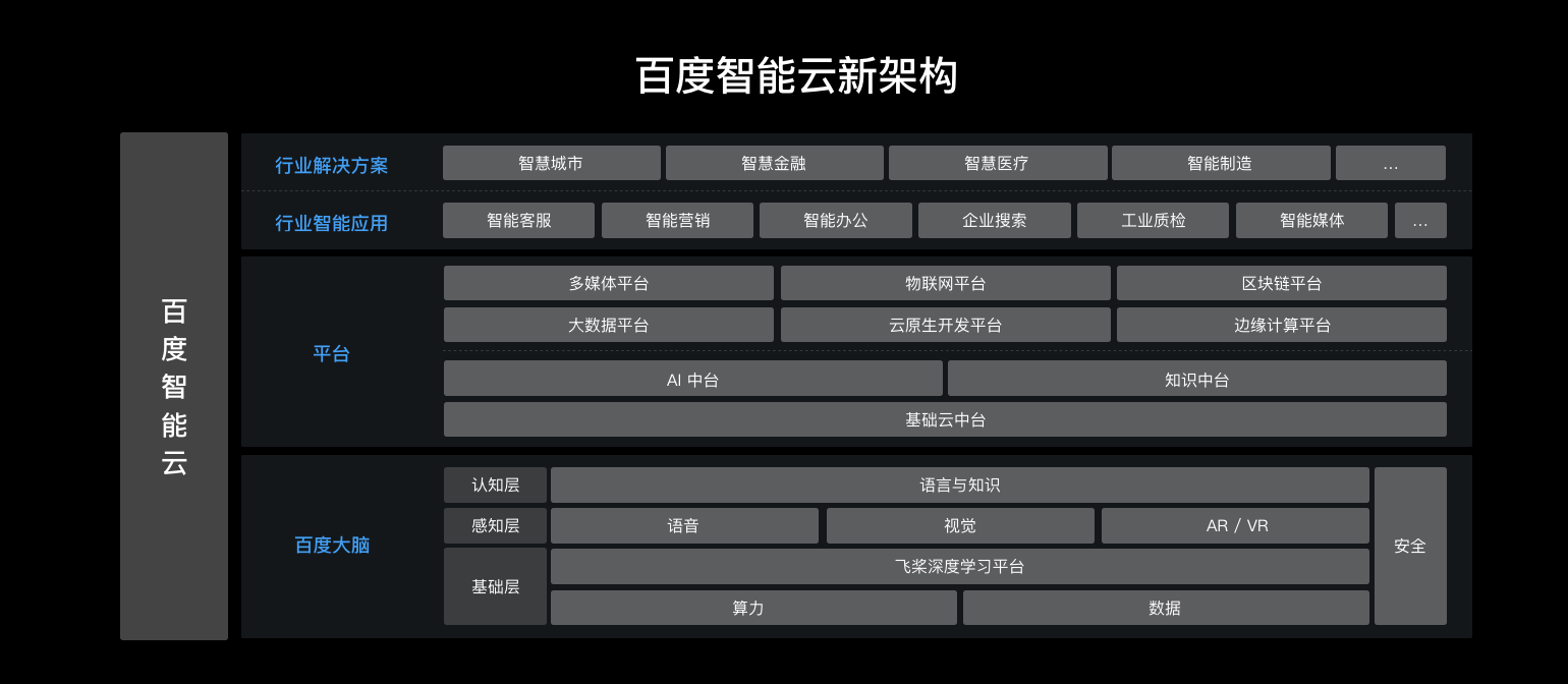 為了更好地執行新戰略,百度智能云對業務架構進行了調整。新架構分為三層,底層是百度大腦,包括基礎層、感知層、認知層和安全,是百度核心技術引擎。中間是平臺,包括通用的基礎云平臺、AI中臺、知識中臺,以及針對場景的平臺和其他關鍵組件。在基礎層和平臺的支持下,上層的智能應用和解決方案將為各行各業賦能。同時,百度智能云打造了一體化的安全體系,全面覆蓋從AI模型安全到行業生態安全的方方面面,為產業智能化發展保駕護航。