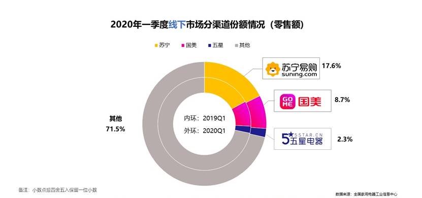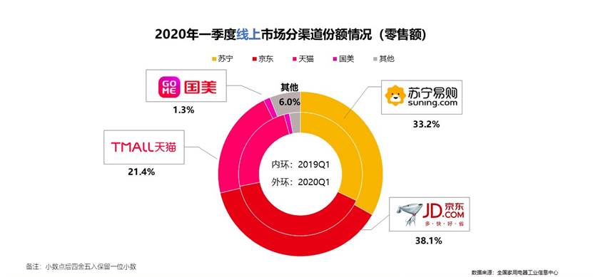 在渠道布局上,疫情改變了傳統家電零售模式,線上家電市場提速發展。2020年一季度,蘇寧、京東、天貓瓜分了線上92.7%的市場份額;國美、拼多多合縱連橫,互補短板。