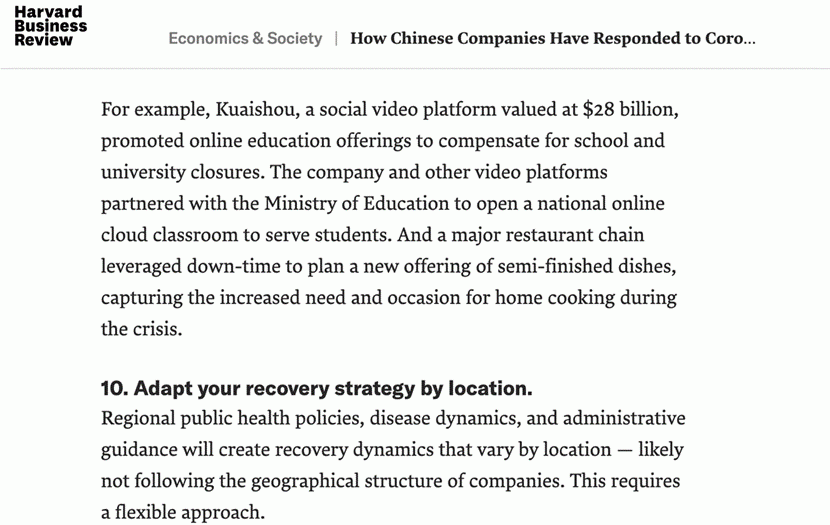 《哈佛商業(yè)評(píng)論》認(rèn)為,盡管疫情在一定程度上影響了所有領(lǐng)域,但許多特定領(lǐng)域的需求卻在增加,以快手疫情期間上線的“停課不停學(xué)”免費(fèi)學(xué)習(xí)專區(qū)為例,說(shuō)明中國(guó)公司非常善于在危機(jī)中發(fā)現(xiàn)需求、解決需求。