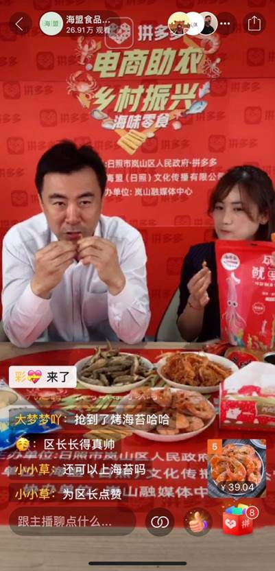 5月20日,山東省日照市嵐山區(qū)區(qū)長牟偉走進(jìn)拼多多直播間,為當(dāng)?shù)睾.a(chǎn)品及深加工產(chǎn)品代言。整場直播吸引了27萬網(wǎng)友觀看,牟偉成功變身海鮮零食的“風(fēng)味推薦官”。
