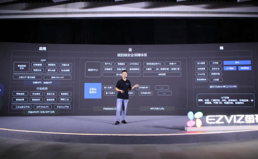 首先,矚目的是螢石EZIoT平臺的發布。所謂EZIoT平臺,是指面向品牌商、產品制造商、方案運營商,提供高效率、低成本的一站式產品聯網及智能化解決方案,核心包括設備連接、設備管理、設備消息推送、語音控制、數據統計、安全保障及App端控制等。