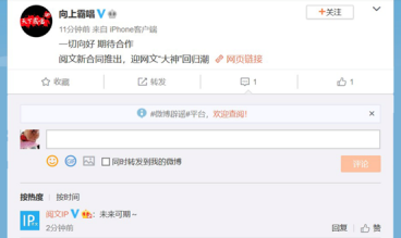 速途網(wǎng)6月12日消息(報道:吳佳馨)今日上午,《鬼吹燈》系列小說作者天下霸唱工作室微博@向上霸唱,轉(zhuǎn)發(fā)閱文集團(tuán)相關(guān)新聞,并發(fā)表八字感言:一切向好,期待合作。閱文IP官方微博也在該內(nèi)容下點(diǎn)贊評論,稱”未來可期“。