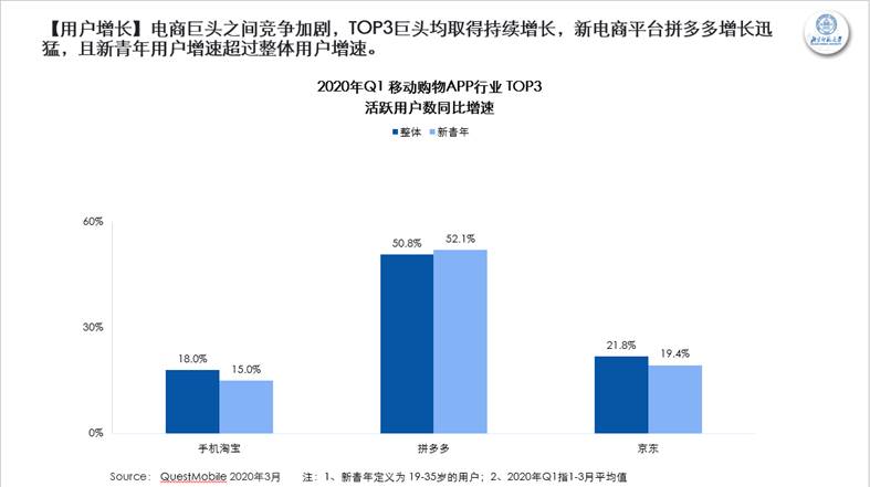 ▲報告顯示,拼多多2020年第一季度增長迅猛,并成為唯一一家年輕用戶增速超過整體用戶增速的群體。這也意味著,有更多的年輕用戶流向了拼多多。