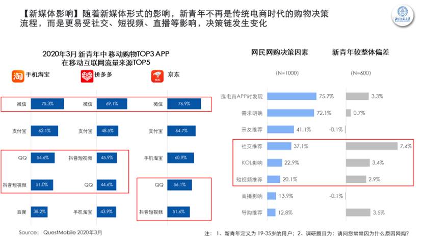 報告認為,新青年的購物決策流程,更容易受社交、短視頻、直播等影響。他們可以通過微信、QQ和抖音等多個APP,接觸到新電商平臺。三大移動購物App,最主要的流量來源是微信,QQ和抖音兩個渠道的流量占比過半。