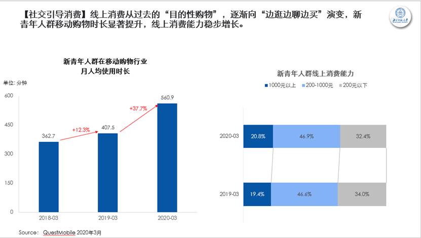 報告認為,這是因為新青年呈現出“社交引導消費”“粉絲經濟引導消費”的特征。線上消費從過去的“目的性購物”,逐漸向“邊逛邊玩邊聊邊買”演變,進而提升用戶黏性。共同拼單、分享購物等行為成為重要的線上消費行為之一。