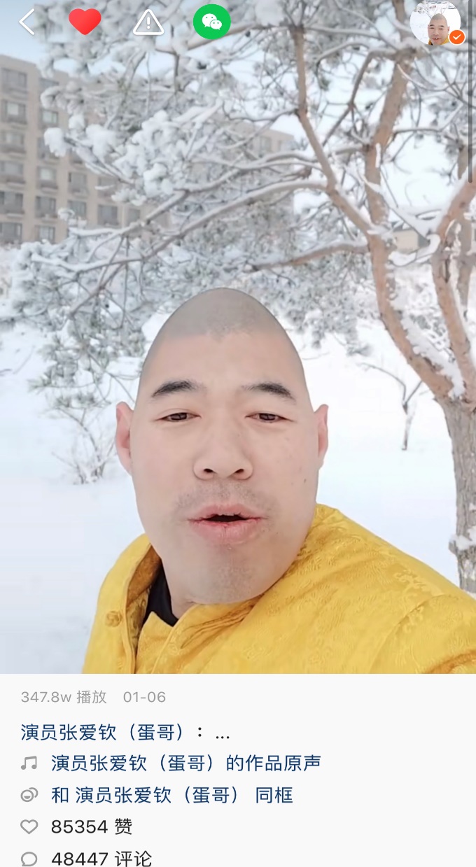 但一開始,“蛋哥”也沒想到視頻會(huì)火。今年1月6日,“蛋哥”將這則視頻上傳至快手。對于張愛欽來說,這不是一個(gè)特別的視頻:在他的快手賬號中,多為自拍視角,拍攝這條時(shí),他只是把往常的聊天,變成了唱歌。