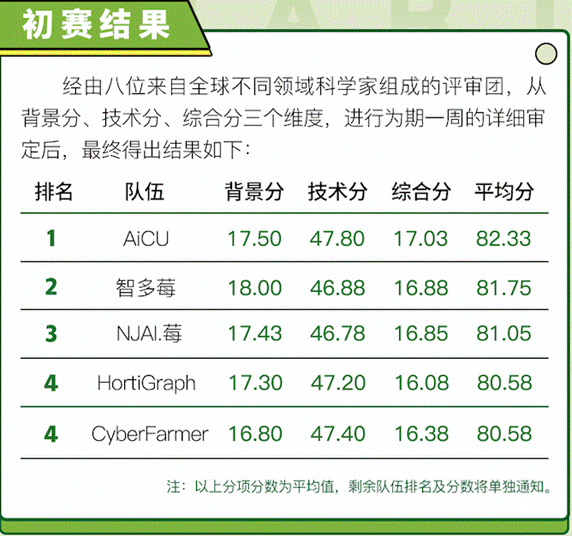 6月24日,經(jīng)過為期一周的激烈角逐和專家評審后,第一屆“多多農(nóng)研科技大賽”初賽結果出爐,在參與初賽的17支科技組隊伍中,共有4支年輕隊伍脫穎而出,分別是AiCU隊、智多莓隊、NJAI.莓隊、CyberFarmer·HortiGraph隊。