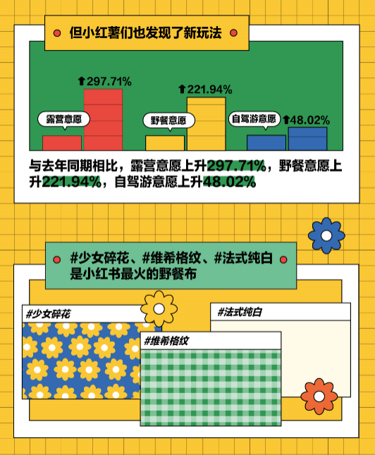 但小紅書用戶也隨即解鎖周邊游新玩法,報告顯示,與去年同期相比,小紅書用戶的露營意愿翻了近三倍,野餐意愿翻了超過兩倍,自駕游的意愿也增長了近50%。