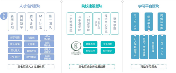 公司圍繞各事業(yè)群院校的業(yè)務及培訓需求,還協(xié)助搭建三七游戲學院、37手游學院、37網游學院、37GAMES學院、技術中心學院、財管學院等在內的院校體系,促進各事業(yè)群文化傳承及專業(yè)能力成長。