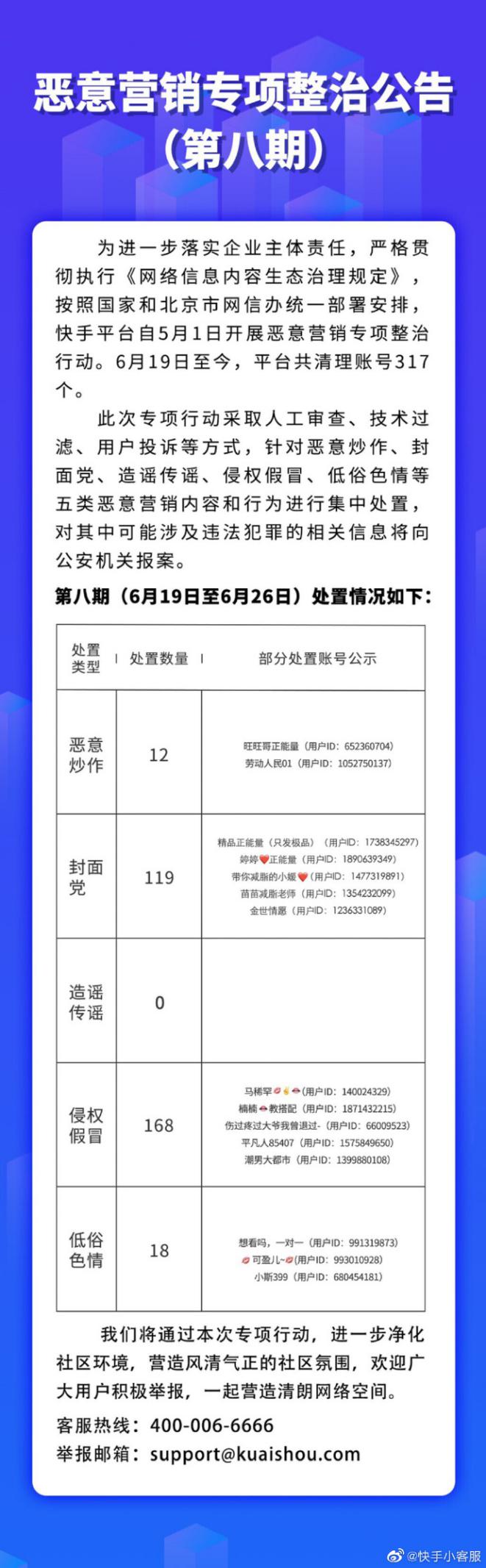 據了解,本次專項行動開始之初,快手平臺在“快手管理員”、微博“快手小客服”官方賬號、官方網站顯著位置主動發布專項行動公告,提出明確整治措施,并公布用戶投訴舉報方式,之后每周五對外發布一周處置情況。