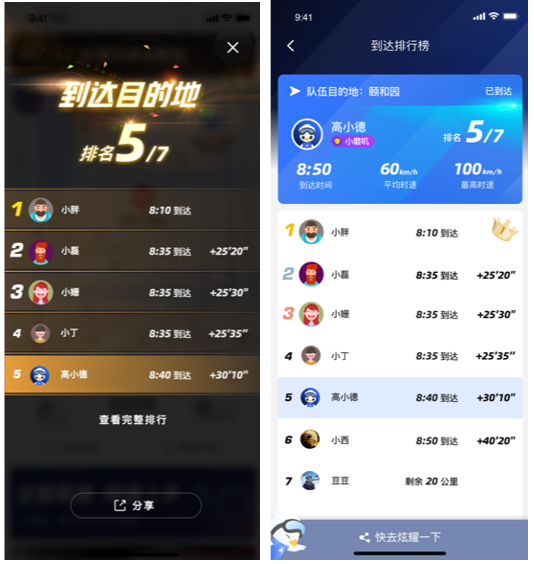 “組隊出行是和朋友們一起自駕游常用的功能,導航過程中我們可以實時看到隊友的位置與動態,如果目的地臨時更改,大家也都能收到彈窗提示特別方便。“李先生說:“朋友們也很喜歡之前新增的排名功能。到達終點后,誰最快誰最慢排行榜一出來,大家調侃一番,還挺有意思的。”