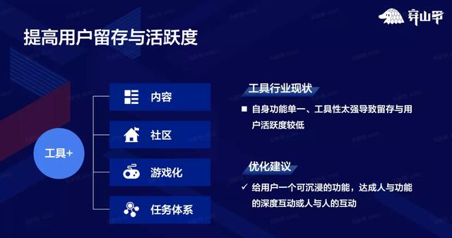 在優(yōu)化這個(gè)問(wèn)題中,穿山甲建議解決工具APP為用戶創(chuàng)造一個(gè)可沉浸的功能,達(dá)成人與功能的深度互動(dòng)或人與人的互動(dòng)入手,以下有幾點(diǎn)建議:例如,增加內(nèi)容模塊:如資訊、小視頻、小游戲等模塊;增加任務(wù)積分體系、成長(zhǎng)體系;增加互動(dòng)社區(qū)、互動(dòng)提示功能;增加游戲化功能:如模擬經(jīng)營(yíng)、寵物養(yǎng)成等,通過(guò)“工具+內(nèi)容”、任務(wù)積分體系、社區(qū)、游戲化等方向的產(chǎn)品體驗(yàn)延伸,去解決工具類產(chǎn)品低留存和低活躍。