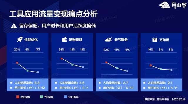留存偏低、用戶市場(chǎng)和活躍度偏低,是制約工具類應(yīng)用變現(xiàn)的最核心痛點(diǎn)。