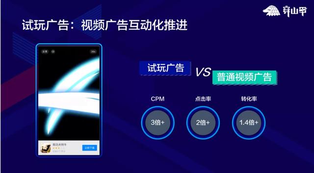 舉一個(gè)例子來(lái)說(shuō)明,以激勵(lì)視頻中的試玩廣告(也稱互動(dòng)廣告)為例,它是一種互動(dòng)性更強(qiáng)的廣告方式,能夠讓用戶短暫體驗(yàn)廣告產(chǎn)品本身,有著很強(qiáng)的交互性和轉(zhuǎn)化價(jià)值。這跟傳統(tǒng)的視頻廣告對(duì)比,點(diǎn)擊率和轉(zhuǎn)化率也呈現(xiàn)倍級(jí)增長(zhǎng),CPM在10倍的基礎(chǔ)上又有提升。