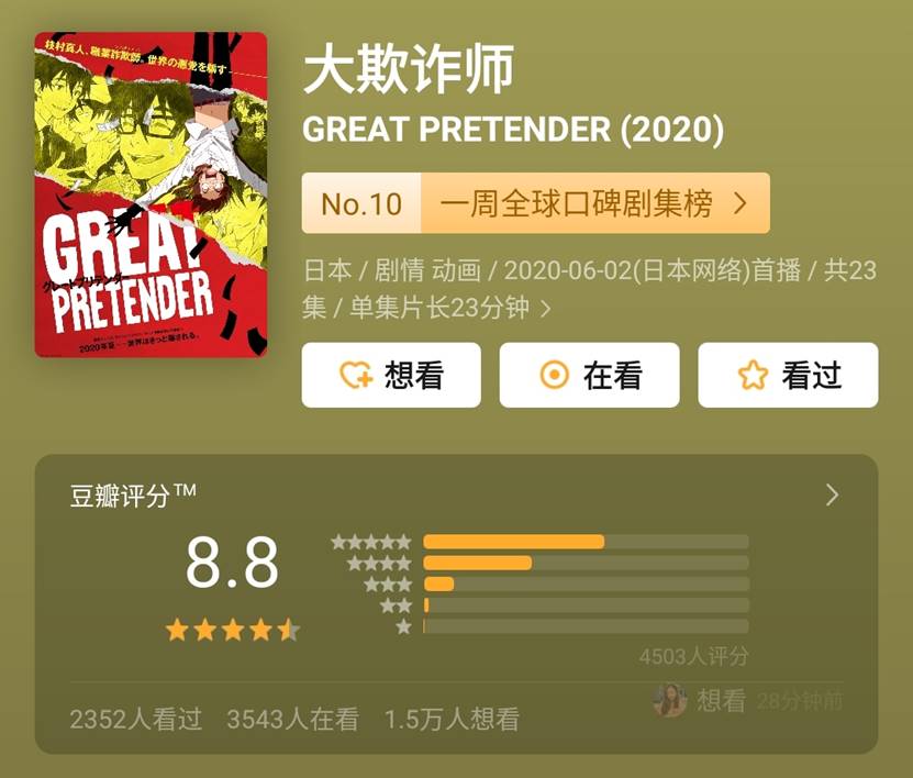 憑著集集有懸念、兩集一反轉、精妙設計一環扣一環,《大欺詐師》讓動漫迷們大呼過癮。目前該劇已經播出14集,豆瓣評分仍高達8.8分,在一眾反響平平的7月新番里,成為了當之無愧的霸權番。