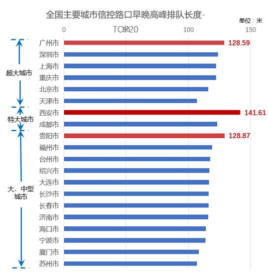 從路口車輛排隊的長度來分析,根據高德地圖交通大數據監測,全國主要城市路口早晚高峰排隊長度的TOP20榜單中以南方城市為主,超大城市和特大城市的早晚高峰排隊長度大多高于大、中型城市。位于榜單前三位的城市分別為西安、貴陽和廣州,西安市路口早晚高峰平均排隊長度達141.61米,貴陽平均排隊長度達128.87米,廣州為128.59米。