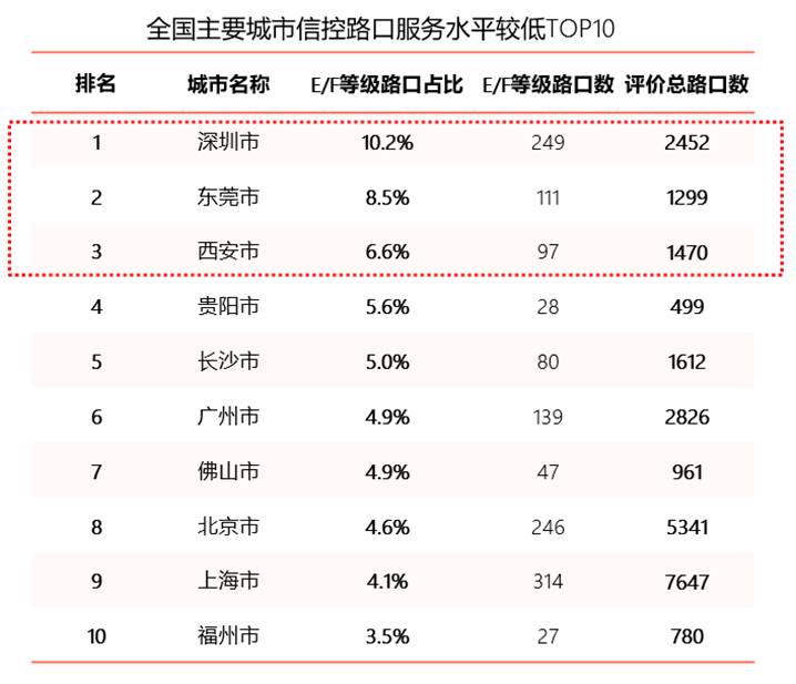 紅綠燈路口服務水平較低十大城市:深圳、東莞、西安排名前三