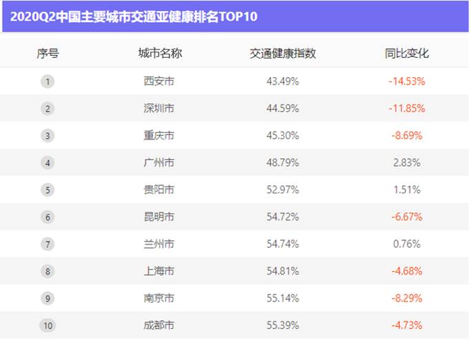 西安二季度交通健康指數為43.49%最低,南通交通健康指數最高