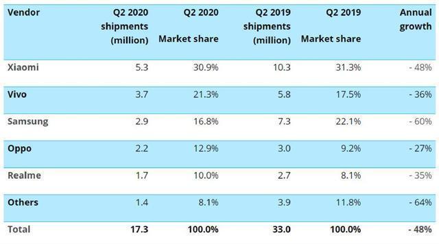 而一加手機(jī)憑借著旗艦機(jī)型,在海外市場受到了認(rèn)可,在2019年Q2一度超越蘋果、三星成為印度高端手機(jī)行業(yè)市場份額的首位。不過,對于印度市場來說,高端手機(jī)市場空間有限,從整體出貨量來看,一加仍然處于Others陣營,可見印度市場的出貨主力仍然是中低端機(jī)型。